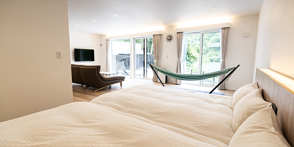 Rukaでは、大きなソファやハンモックに腰を掛けながら、Kuusamoではデイベッドでくつろぎながら、湖とガンケをお楽しみいただけます。